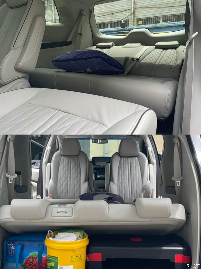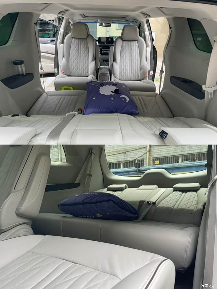 (3)升级后:二排座椅反转,第三排座椅座椅放平,完全可以当成一个大床房休息,偶尔旅行或者中午休息起来很舒服。空间变得更大了。