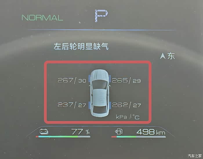 我通过方向盘滚轮切换,把胎压显示功能置顶于仪表盘正中间,个人认为这是关乎生命安全的配置,一定要放在显眼的位置。胎压显示系统可以实时显示,每个轮胎的压力值和温度信息,让我在行车途中对这些关键信息做到了如指掌,尤其是高速出行、酷暑天气,使得行车途中,安全方面更多了一份保障。
