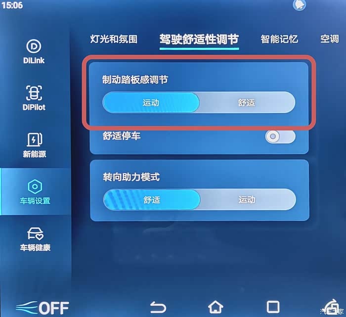驱逐舰05刹车模式可以通过中控屏进入“车辆设置”,子菜单可以选择运动模式和舒适模式,总结下来两款模式刹车动态效果大差不差,都是偏软、偏舒适的刹车脚感,明显感觉刹车力度不太够,有点浪费这样的配置。