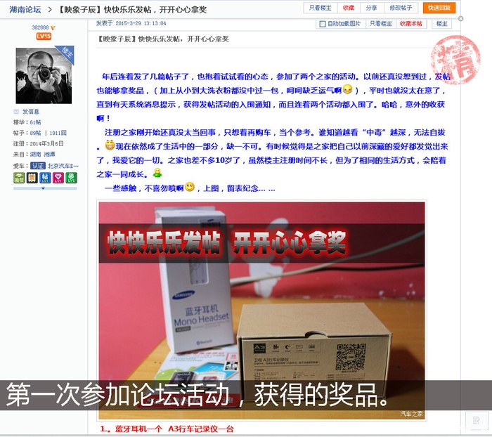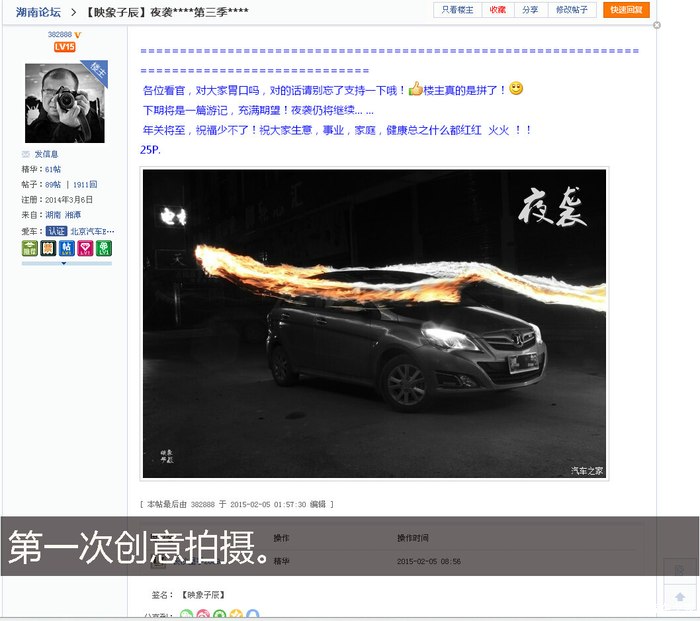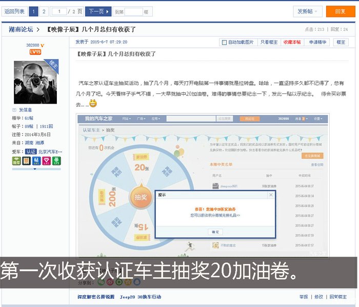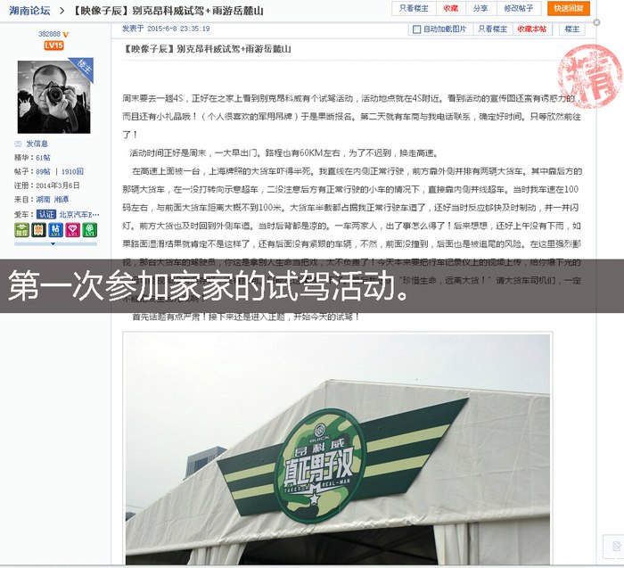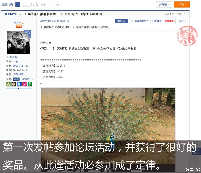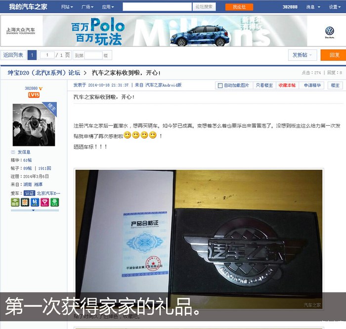 从没有过任何论坛经验的我在家家也算是新人了,注册一年多点。刚开始都只是资深潜水员,这里查查,那里看看。自己中意的各款车性能指标对比什么的,提供参考。到后来把车买回来后,在车系论坛发出第一篇提车贴之后。我发现自己便一发不可收拾了!一年的时间,从1到15级的跳跃,感觉自己也是蛮拼的。这里也要感谢北汽绅宝D20版主老大,第一次发帖就给了精,让我有勇气和动力开始自己的家家生活。之后信心满满的我开始混迹各个论坛,欢动论坛,自驾游论坛,模型论坛,等等... ...最多的还是地区论坛,在这里有很多从未谋面的“家人”,以后一定有机会和大家见面认识。在这里也要感谢欢动论坛,和自驾游论坛的版主老大,有机会让我的帖子上论坛首页露脸,受到那么多“家人”关注的感觉真好!同时,我也感觉自己帖子的质量慢慢有了提升,接下来的日子我将更加努力,记录更多生活中精彩,和“家人”们一起分享。