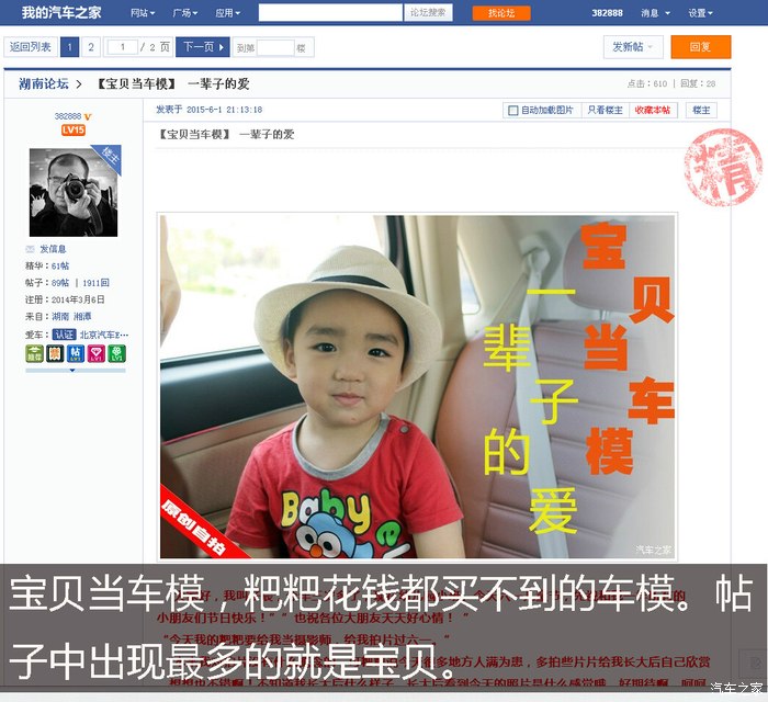 汽车之家十周年了,但我真正开始家家生活,还是在去年年初。当时自己有一辆小面,并且自己是做物流快递行业的,小面的全部功能都放在了快递运输上面。小面已经不再胜任家庭成员出行的任务。所以,再购置一辆车提上了日程,而最初的“海选”放在了汽车之家这个平台。当初也真没想在家家注册成为会员,并投入那么多的精力,享受家家带给我的欢乐。所以,我的注册会员名真没多想,就直接了当的选择了自己的工号。(有时候感觉像... ...什么号来的,)后来真正投入其中之后才发现想改都改不了,哎!也罢,其实这个号码也不错的,这么多8.而且我家宝贝是3.8什么节来着生的,我的车牌也用的38,也算有缘吧!