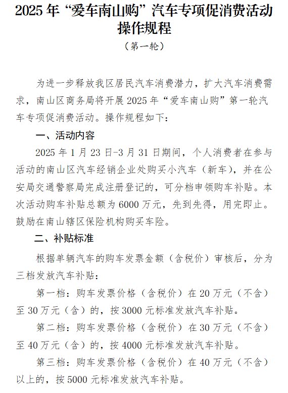 2)深圳南山区购车补贴: