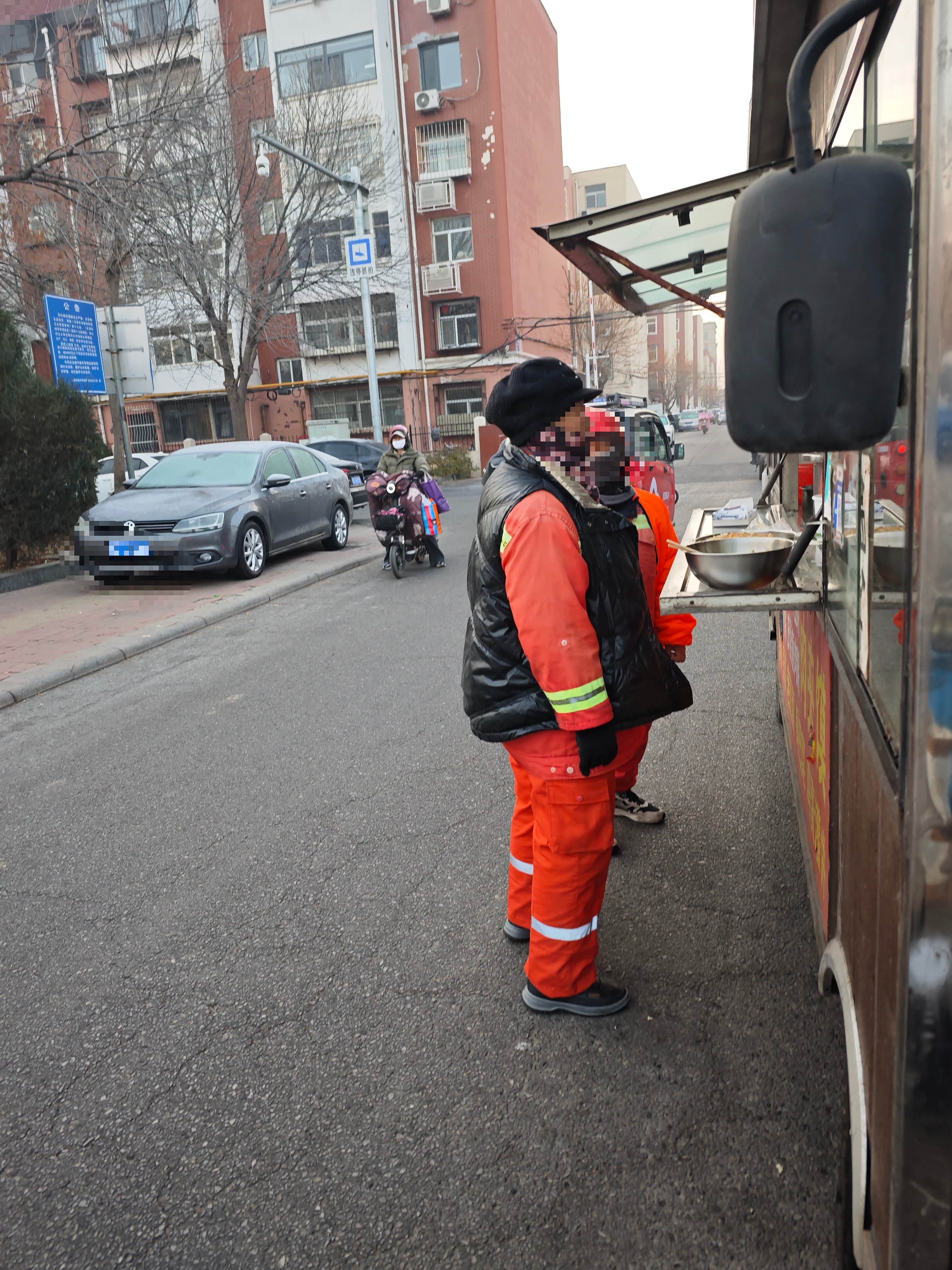 而图三则是我在买早点时面向东方拍摄的干枯的树枝,虽然已经干枯,但也有他的干枯美,所以我拿起手机记录了下来。图四是两位。环卫阿姨相约来吃早点,而摊主叔叔也非常好,还给阿姨免了5毛钱,小本生意,能主动说少给0.5我觉得已经非常不错了!大家都是好人,所以我拍下环卫阿姨在摊前等早点的照片!