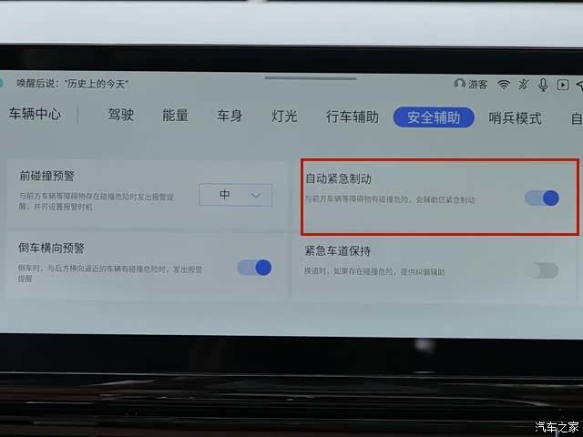 4、点击自动紧急制动选项右侧的圆圈图标,开启自动紧急制动功能。如果驾驶员制动力不足,自动紧急制动功能将辅助驾驶员制动;如果驾驶员完全未做出反应,自动紧急制动功能将主动施加制动以避免或减轻碰撞事故造成的伤害。