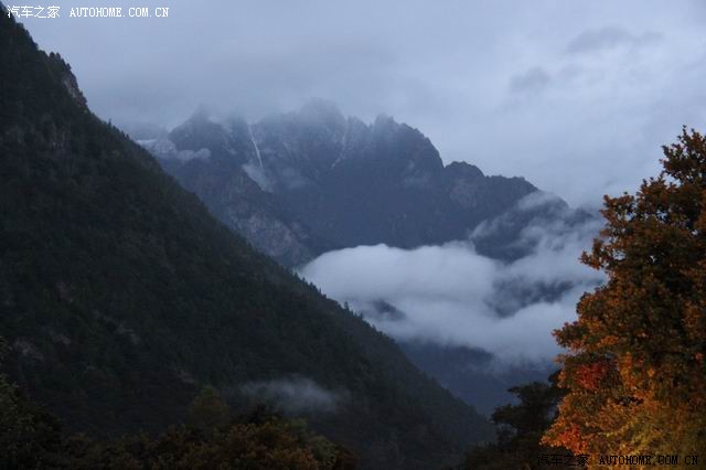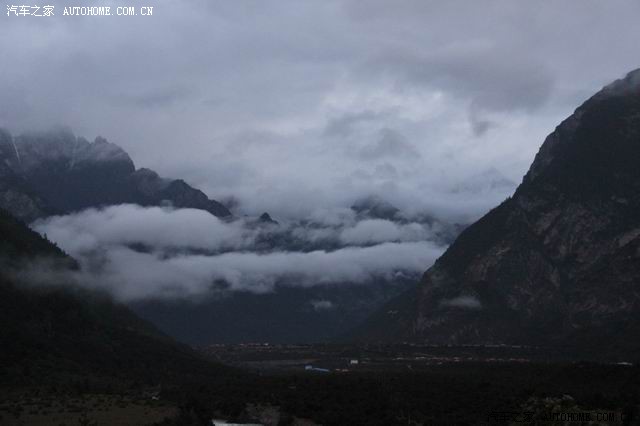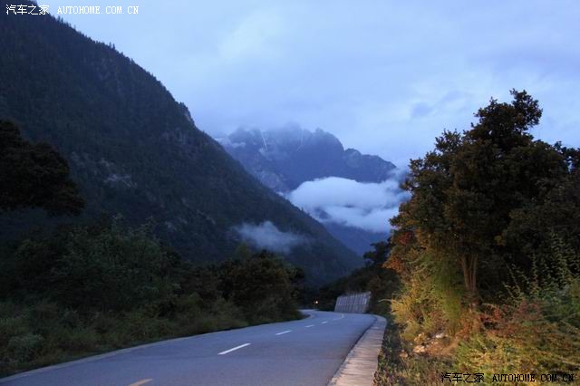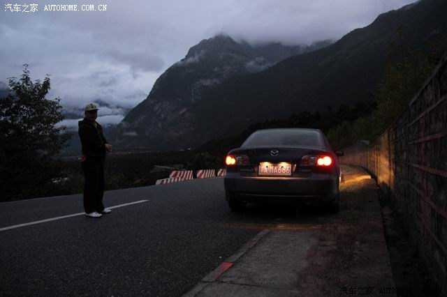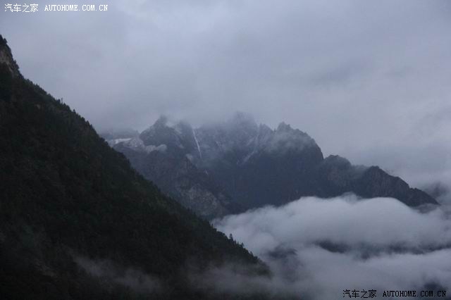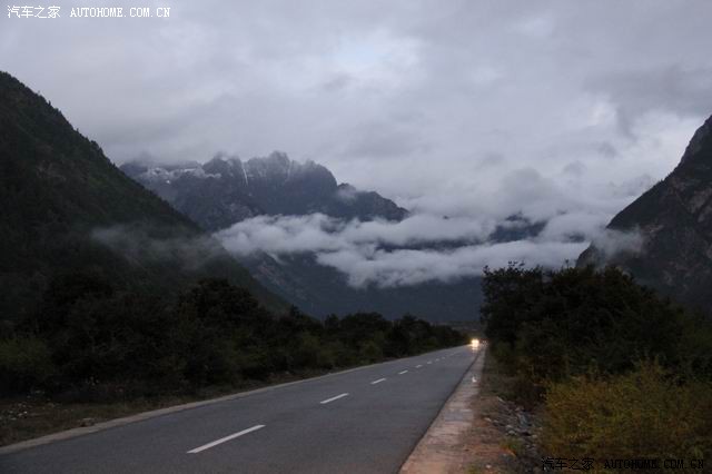 第二天一早五点左右我们就起床了(因为据说六点后就封路了),简单的洗了脸,没吃饭就上路了;天太黑,路面和远方也不清楚,但起来赶早的车辆也不少,一路行来,呼吸着湿润的空气,外面还有些小雨,这个景况分明是江南烟雨的季节,哪是有一分高原干燥明亮的影子;