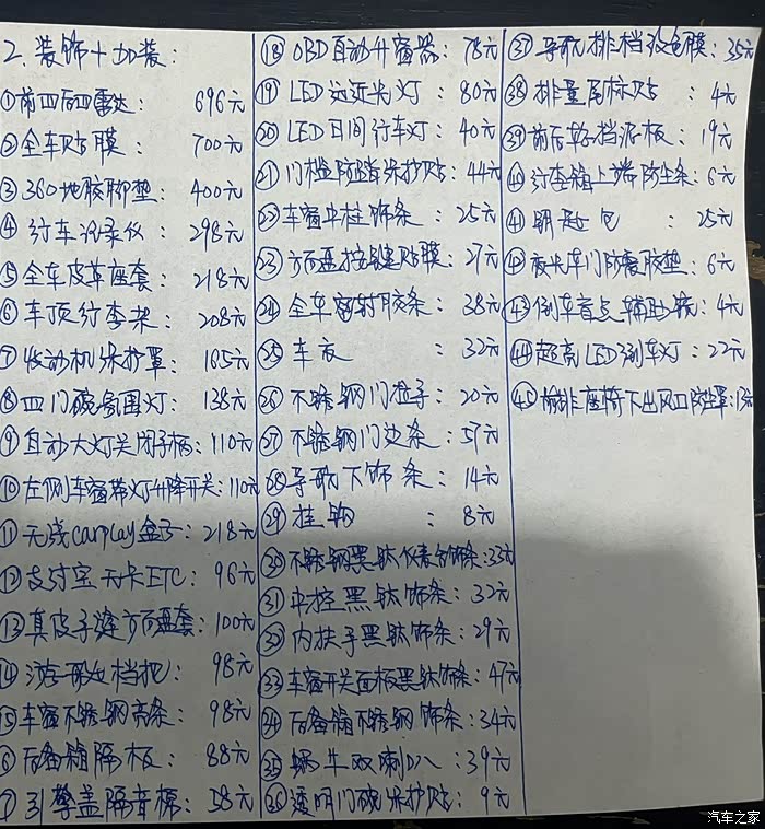 9月26日提的车,目前开了一个多月了,自己也七七八八加装或者改了一些,鸣笛喇叭和引擎盖隔音棉是最早开始加弄的,后面还改了自动大灯拨杆,真皮方向盘,还有360软包脚垫,这个是买车后回自己所在的城市实体店装的和皮质方向盘一起800元(买车送的说的价值1680,实力就值168,太垃圾了),看看改加的东西吧!这些算起来也五六百了。