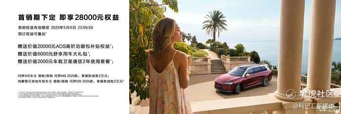 首销期即刻下定,赠送价值20000元ADS高阶功能包补贴权益;赠送价值6000元舒享用车大礼包;赠送价值2000元车载卫星通信2年使用套餐;问界M9车主增购/换购问界M9,享尾款减免3万元;鸿蒙智行其他车型车主增购/换购问界M9,享尾款减免2万元;首销权益有效期至2025年5月6日23:59:59,预订权益可叠加。