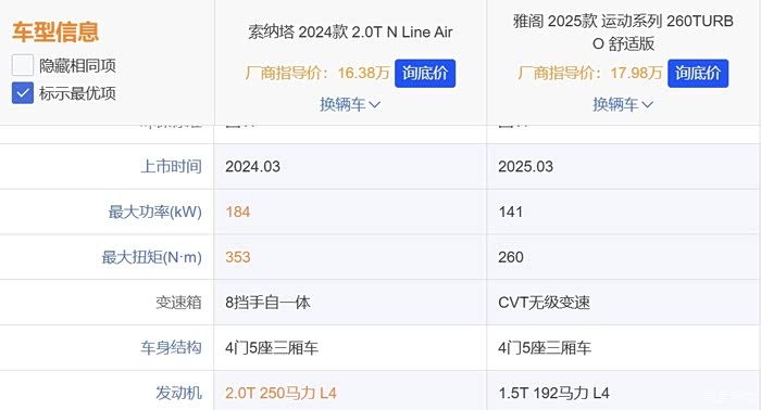 之前选车的时候,很多人都推荐日系车,说日系车省油、耐用。但我对比之后发现,索纳塔和日系车比起来,优势也很明显。就拿本田雅阁来说,索纳塔的空间比它大,后排腿部空间更宽敞,坐起来更舒服。动力方面,索纳塔 2.0T 发动机动力比雅阁 1.5T 强不少,超车更有信心。而且变速箱也比雅阁的CVT更加平顺,而且索纳塔的配置更丰富,像全景天窗、座椅加热等配置,在同价位的日系车中很多都没有。