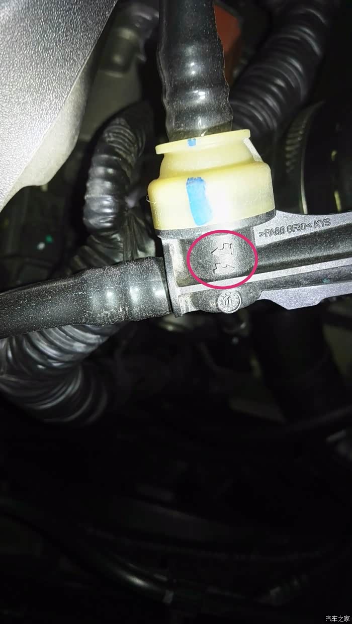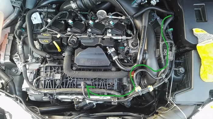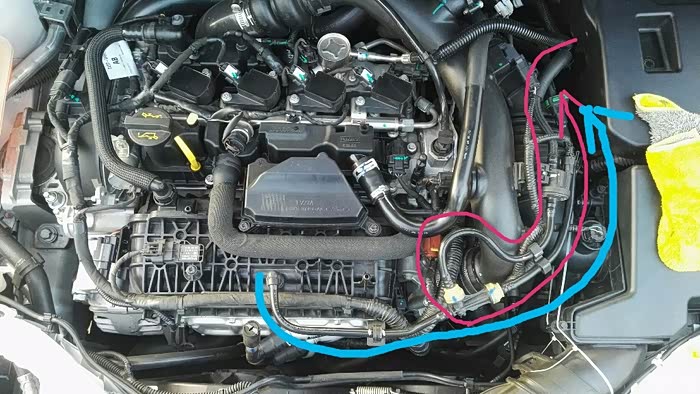 看一下蓝色的管路,这是1.5t发动机的燃油蒸汽回收管路。A点通过管道连接到车尾的碳罐,B点接入发动机进气歧管,C点接入进气道。余下的是碳罐电磁阀和三通。