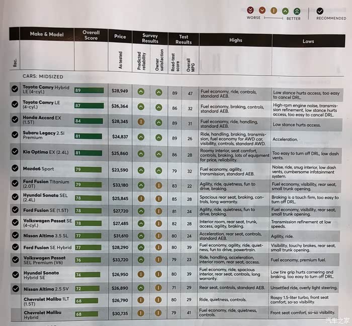 B级车哪个好,可以参考一下美国这本汽车消费杂志的综合评分,这是今年7月期的,是北美公认比较客观的测评。