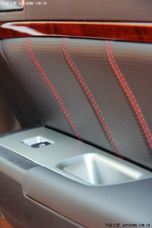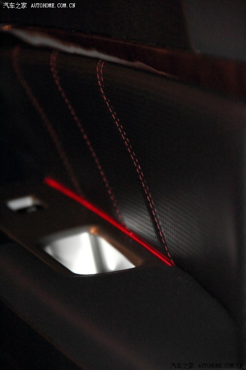 车门特写,红色缝线和打孔皮质都很不错。