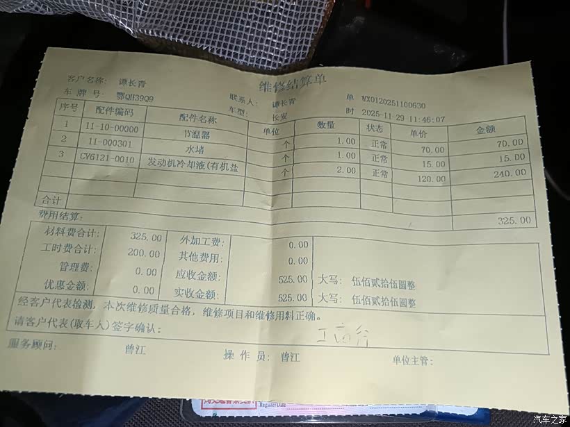 我是长安星卡pLus车主,于2014年4月中旬购车,到今年11月份有一年半多时间,共行驶7万零几百公里,这一年半时间正常保养,车用着也还可以,油耗各方面也满意。可11月28号早上出车时检查,发现地上有漏水的痕迹,仔细一看发现漏的是防冻液,我没敢耽搁,加了瓶矿泉水后直奔四S店,拆车检查后发现是进气支管下面一个“水堵"渗漏,拆开水堵发现水堵头都锈蚀穿了(如图),四s店给出的结论是防冻液含有腐蚀性,我这防冻液还是车辆出厂的防冻液,今年夏天补了点,大概也就半瓶矿泉水那么多。四S店说我这个车(2年或5万公里内),现在已经超过保修了,要自费,没办法,只有自费,配件加防冻液工时费共525元。我认为这个水堵头是质量问题和设计缺陷!发这个帖的目的,是想厂家在这个细节上能引起重视,品控更严一些,也愿长安品牌越来越好!