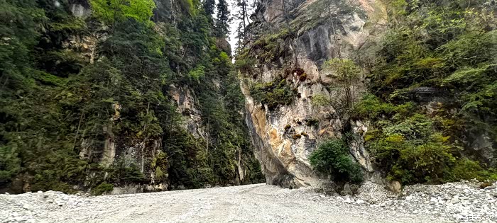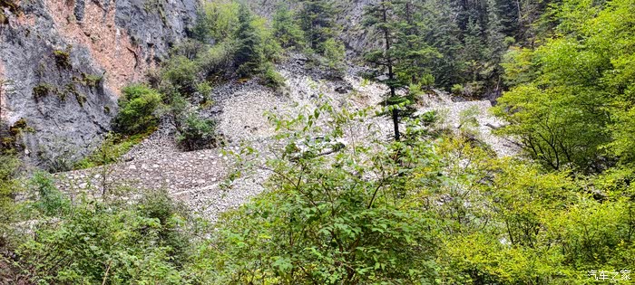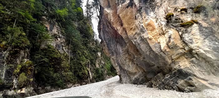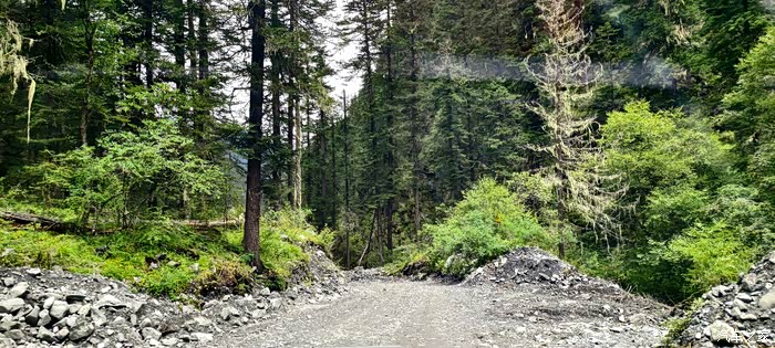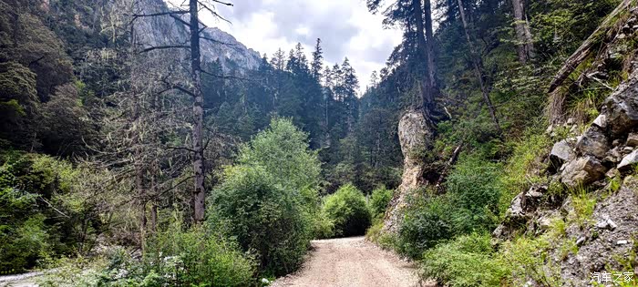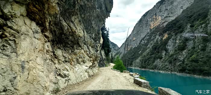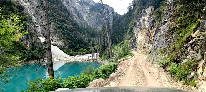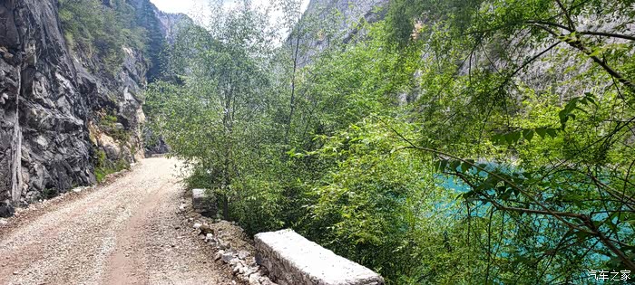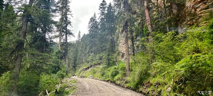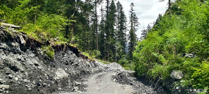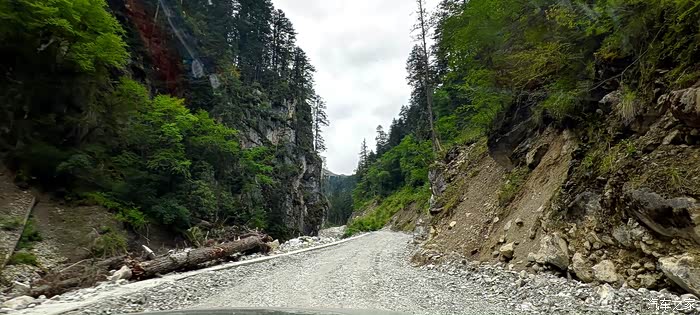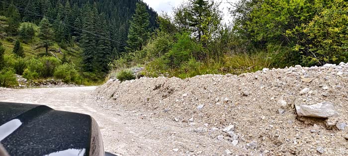 这就是在巴巴沟(蓝松湖)前往牦牛之心景点非常狭窄,不容错车的坑坑洼洼、异常颠簸的非铺装道路的路况。
