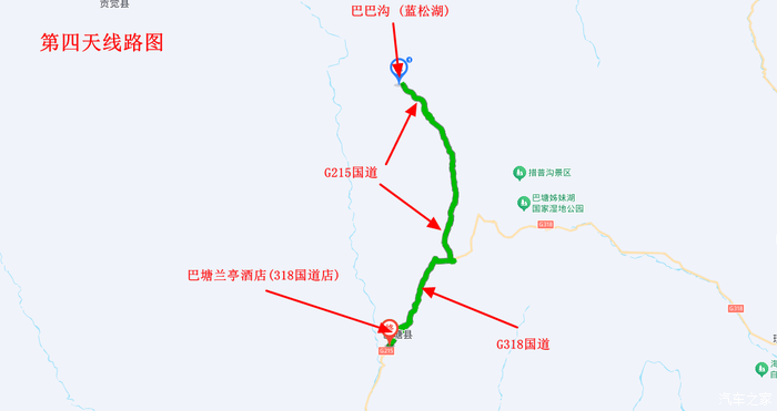 巴塘—G215国道—前往巴巴沟(蓝松湖)与G215国道的三岔路口—巴巴沟(蓝松湖)—牦牛之心—巴巴沟(蓝松湖)—前往巴巴沟(蓝松湖)与G215国道的三岔路口—G215国道—G318国道—巴塘,全程约246公里左右,途经:G318国道、G215国道