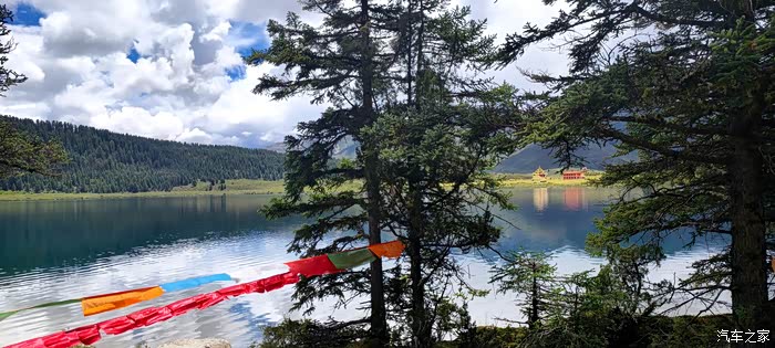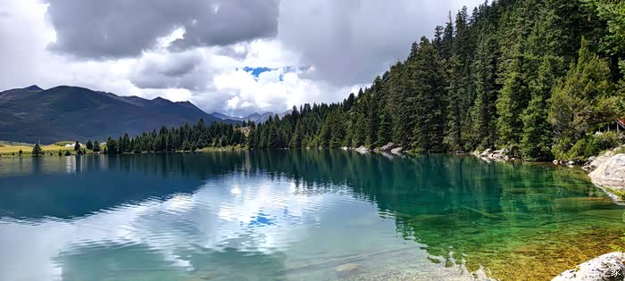 康珠拉措四周森林环绕湖面,波光粼粼湖面倒影出美丽的色彩,给我们一种宁静之感