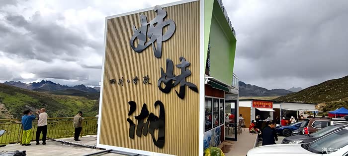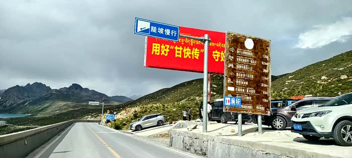 G318国道姊妹湖观景台外上树立有“陡坡慢行”、海子山爱情海景区、措普沟景区入口等提示牌,打卡是必须的