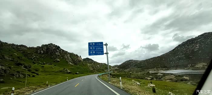 继续拍照打卡记录——“理塘110公里雅江250公里成都730公里”道路提示牌