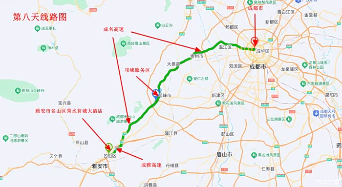 从雅安市名山区出发,经G5京昆高速、成温邛高速等道路,顺利安全回家