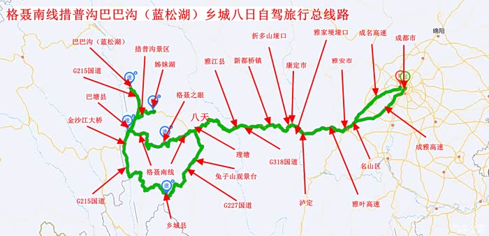 成都—雅安—康定—中谷村—康定机场—新都桥—雅江(住1)—理塘—格聂镇—格聂之眼—新冷古寺—波密乡(格聂南线)—波查—巴塘(住2)—措普沟景区—G318国道—姊妹湖—巴塘(住3)—G215国道—巴巴沟蓝松湖(巴巴海)—巴塘(住4)—竹巴龙乡—川藏线318国道金沙江大桥—苏哇龙乡—昌波乡—噶丹桑披罗布岭寺—青德田园观景平台—乡城德吉岭卡民宿(住5)—桑堆—海子山—理塘—雅江瑞鸿大酒店(住6)—新都桥—康定机场—折多山垭口—康定—雅家埂垭口—磨西古镇—泸定—雅安—名山(住7)—邛崃—温江—成都