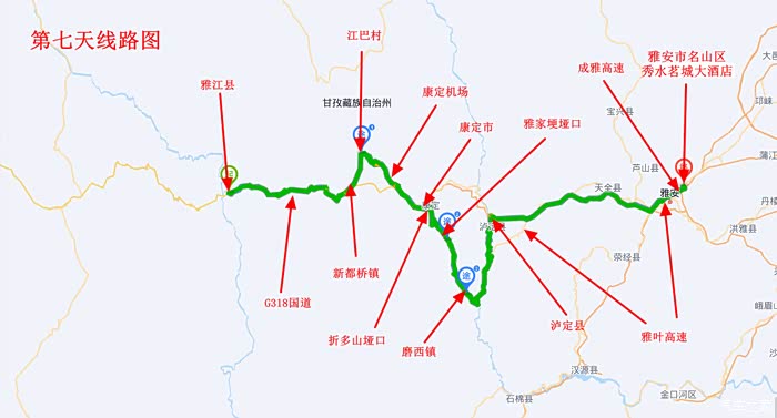 瑞鸿大酒店—新都桥—江巴村—康定机场—折多山垭口—康定—榆磨路—雅家埂垭口—磨西镇—泸定—雅安—名山—秀水茗城大酒店