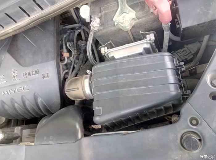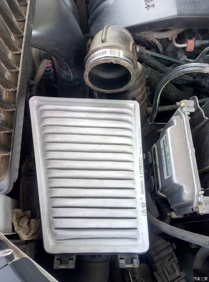 空气滤清器黑色盖子已经取下,空气滤清器滤芯不是太脏。去年11月份我曾自己更换一次新的滤芯,所以不脏,决定不予更换,只把浮灰清理干净再难安装上就行了。