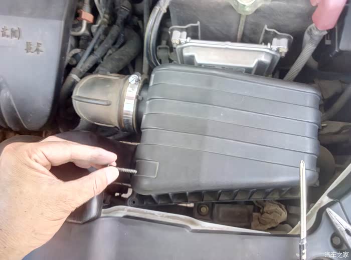 卡好空气滤清器盖子把两颗固定螺丝意义安装到位,每颗螺丝对号入座。