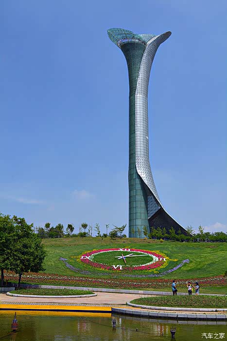 ▲ 形状如百合花盛开的黛青色高塔笔直地冲上蓝天,顶端弯开呈喇叭状,玻璃幕墙从底座一通到顶,气势恢弘,