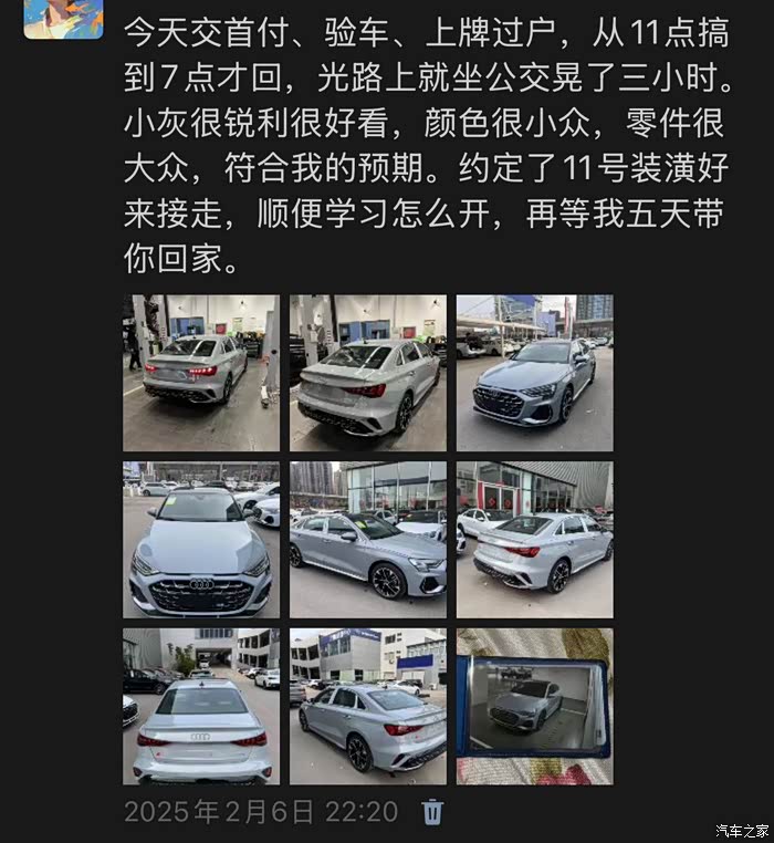前面说过了我不喜欢高8的设计,现在的8.5虽然加了些棱角,但一样还是软趴趴没精神,要不看看现在的A3 45吧?有这个念头就打开汽车之家,突然看到A3中期改款的新闻,外观设计深得我心,发动机居然在中期改款换了,还换了个高尔夫同款。不过以前A3也跟高尔夫穿一条裤子,问题不大。以前我会考虑动力,但开了这么多年车我发现自己的驾驶习惯是很稳重的那类,从来不深踩油门,也不激烈驾驶,所以动力够用就行,小黄1.6自吸 105马力我觉得不够用,小灰1.5T 160马力从账面上看足够了。确定A3我就开始与家里讨论,我妈是最先看上的,说就这个了,我爸本来说我俩先去给他拍照片,结果初五那天也跟我们去了,当场订车买A3L