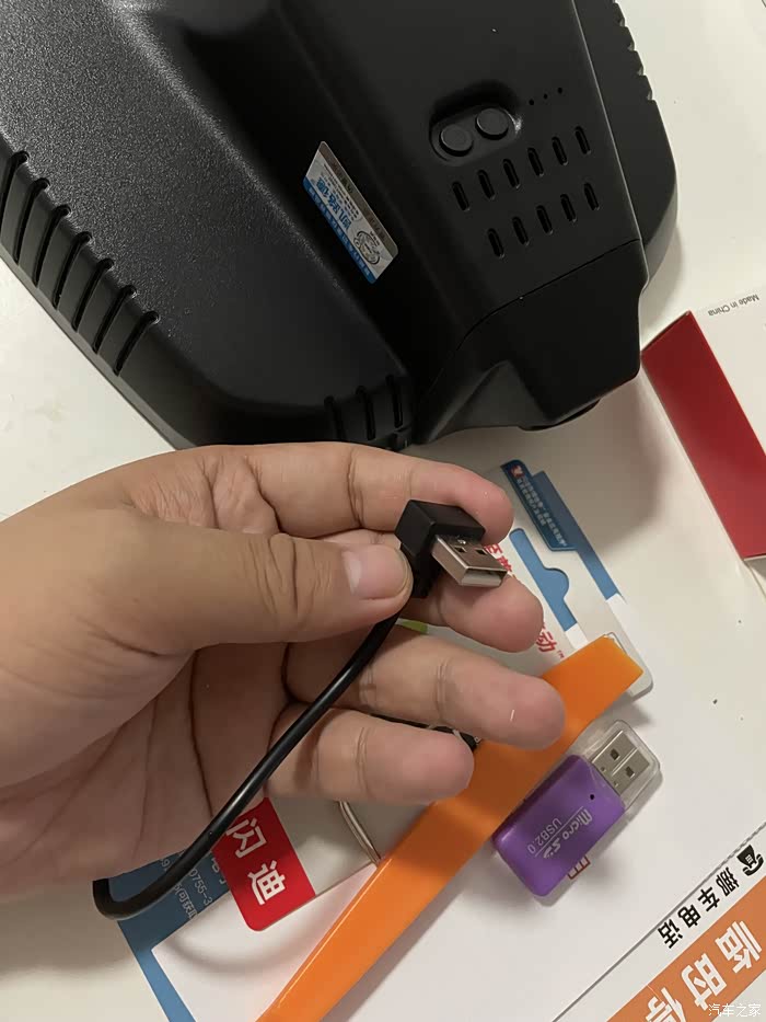 凯路德C1记录仪主机,这个配套的USB取电插头短线,大概十厘米的样子,长度正好,插上就能用。记录仪主机是5V的,原车USB接口也是5V的,即插即用。但是锁车就没电了,要监控得走线保险丝取电,保险盒在座椅下面,比较复杂一般不建议。