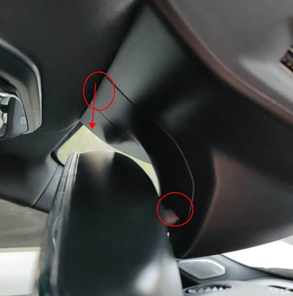 记录仪主机对齐,从右上角分出USB接头,不用担心不会压到,因为原车顶棚是很软的