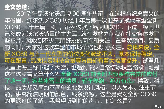 大家好,这一期给大家带来的是沃尔沃全新XC60在上海的试驾体验。沃尔沃这词在我们很多人看来都是以安全立身为本的品牌车型,这款全新XC60也不例外,要介绍的内容我都会在帖子里穿插,那么就直奔主题吧……