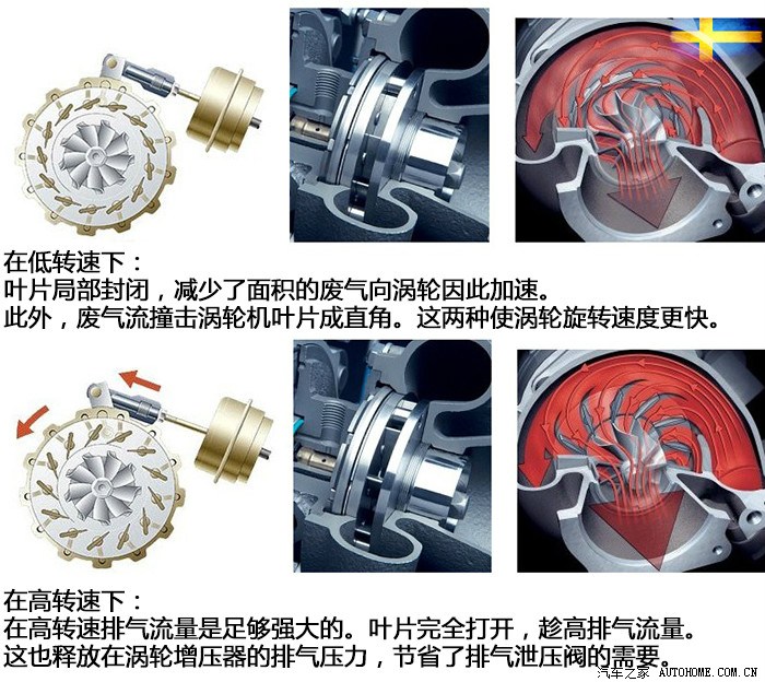 上图的这颗涡轮是三菱重工为宝马代工的一款,零部件代号TF035-VTG,从型号上我们看到他拥有VTG技术,VTG可以翻译为涡轮可变叶片技术,这项技术最早出现在1988-1989年的本田里程上,具体工作原理如下: