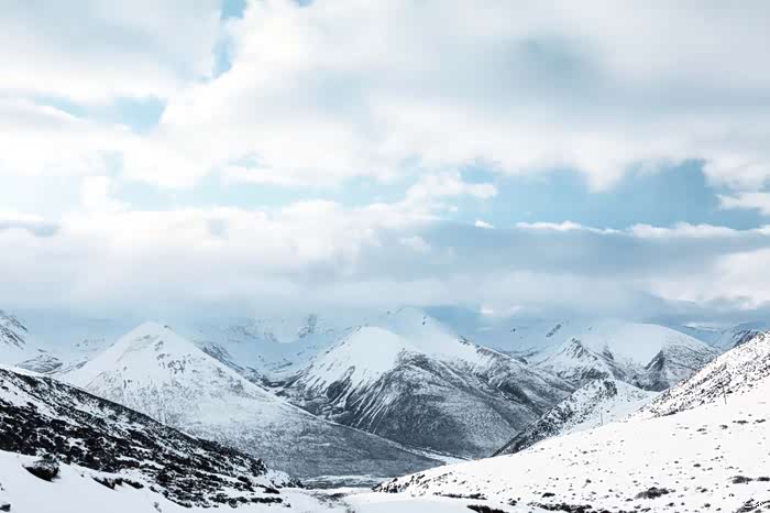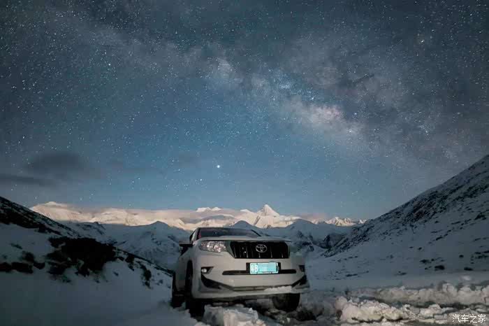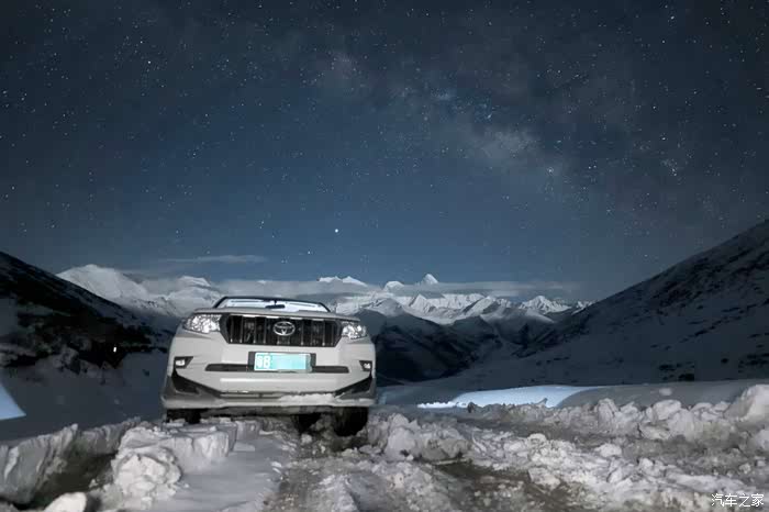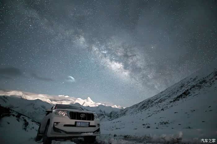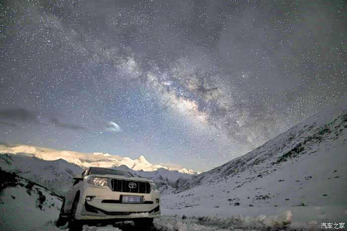 我打算继续往前开,此时已经半夜,开了几百米,我发现后面的路要难走的多,晚上路也看不清,下了雪路也被覆盖,实际上过了垭口是挺长的急弯盘山路,于是打算回去雅哈垭口,毕竟那里有人烟。掉头掉了好一会才掉过来,结果很快就陷进去了,开了低四锁了中差也没用,轮胎一顿乱挠就是不前进,折腾了半天最后只能决定原地休息,看明早天亮了是否能自己出来。这时已经是三更时分,我隐约看到垭口那里有两个人影,或许想看看我这里是否需要帮忙,想想太晚了,还是原地休息吧。此时,月光暗淡,云层褪去,满天繁星像被子一样笼罩在贡嘎山上方,我拍了一些照片,没多久云层重又飘过来遮蔽了星空。实际上我发现陷车的地方拍风景比雅哈垭口更好一点,雅哈垭口前面被雪山挡了一部分不够开阔,往前走几百米拍照更加开阔。