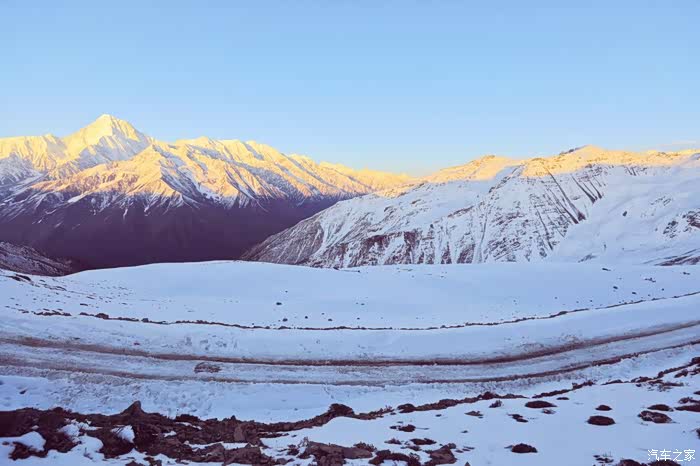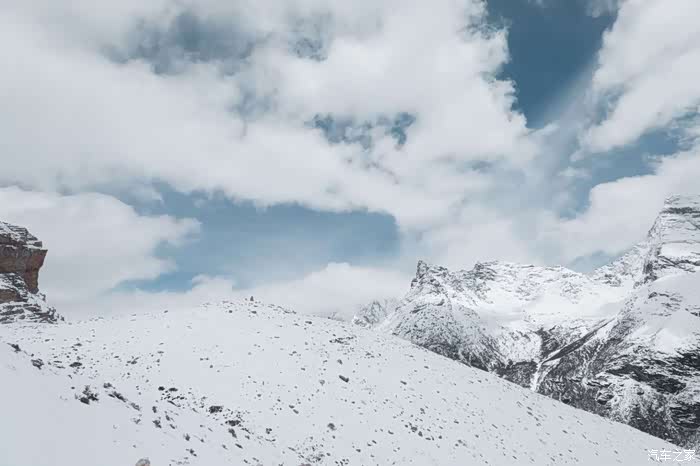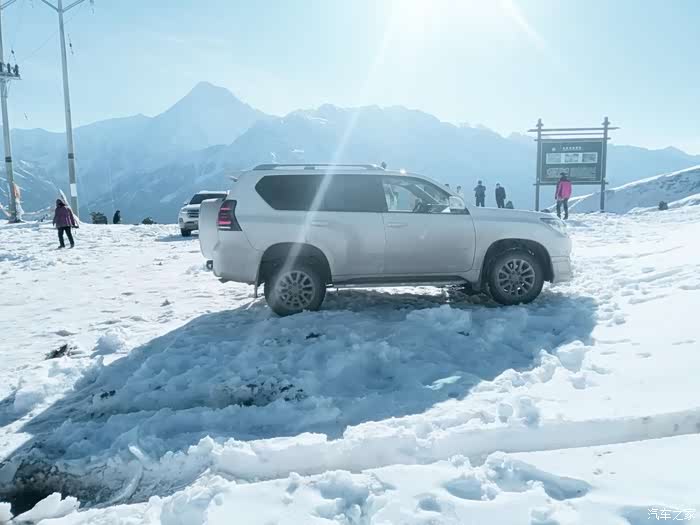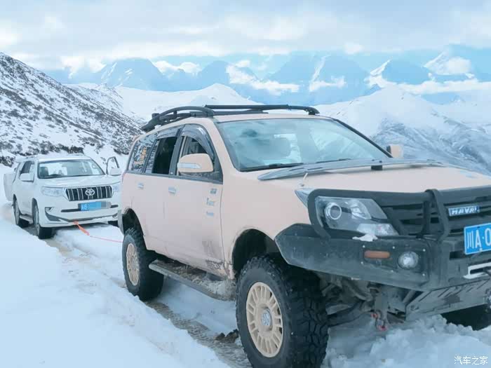 第二天一大早,我起来之后发现大白还是没有办法把自己刨出来,没多久远处来了一辆川A爆改哈弗H5,左扭右扭在雪上飘着前进,到了离我不远的地方实在太滑也走不动了,川A有绞盘,就把绞盘系在大白的拖车钩上把自己拉了上来,然后又系在大白前面的拖车钩上,很容易就把大白拖出来了,然后又拖着一起加油上了雅哈垭口。