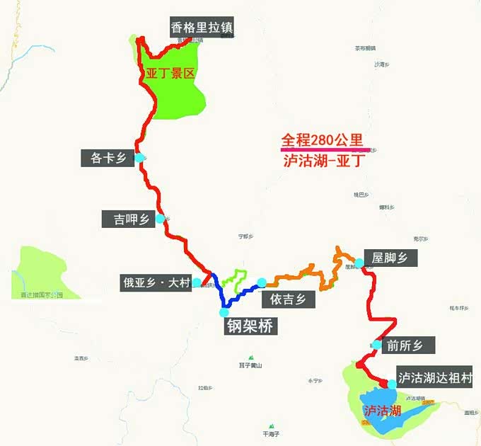 泸亚线虽已修通,但是地图上还不可以直接导航,要先导航到依吉乡,开一段路到俄亚乡(只有这一段还没有导航),再导航到亚丁,网上找好路线,岔路不多一般也不会走错。