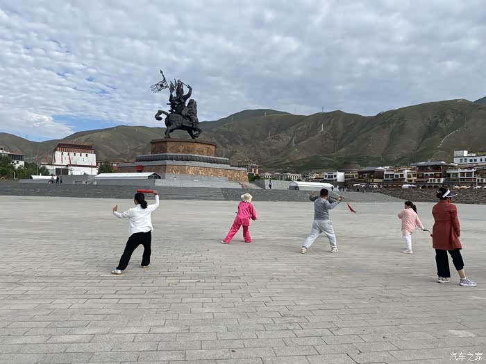 我们按昨晚和打拳的大姐约好的时间 ,来到广场,兴趣盎然地和他们一起练太极。没想到在海拔三千多的高原,居然把太极拳剑玩了一遍,虽然气喘吁吁,能坚持练完已经很不错了。老公也一板一眼地练了他最喜欢的陈氏老架。用大姐的话说:这里能打,回去那更是随便打喽
