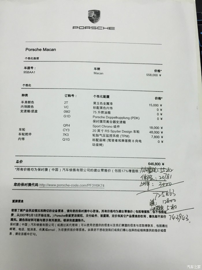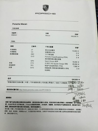 毕竟是三线城市(到底中山算几线我不知道,随便说的,就是一个小城市)的销售中心,地方不大,只有几台展车,就是每款车有一个型号,接待我的销售不算热情,但态度不错,毕竟我只是买最便宜的macan2.0,店里没规定要选多少配置,但必须在店里买2万块东西,什么精品啊,燃油添加剂啊,贴膜啊,还要在店里买保险——21000元。选配销售基本没有给我主观上的意见,只是告诉我这个是什么,那个会怎么样,其实我也不需要她给我什么意见,毕竟我是泡论坛的。