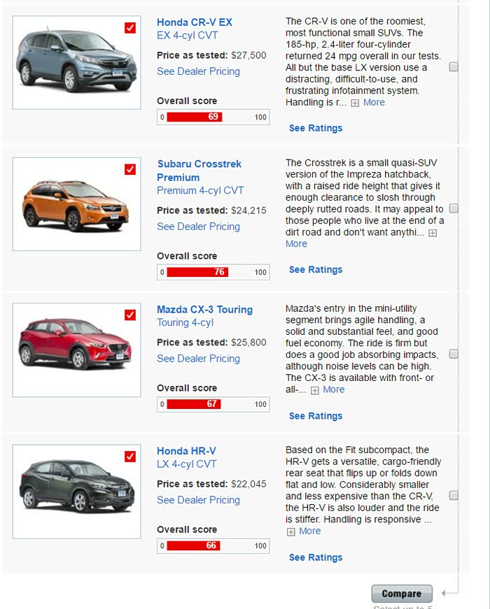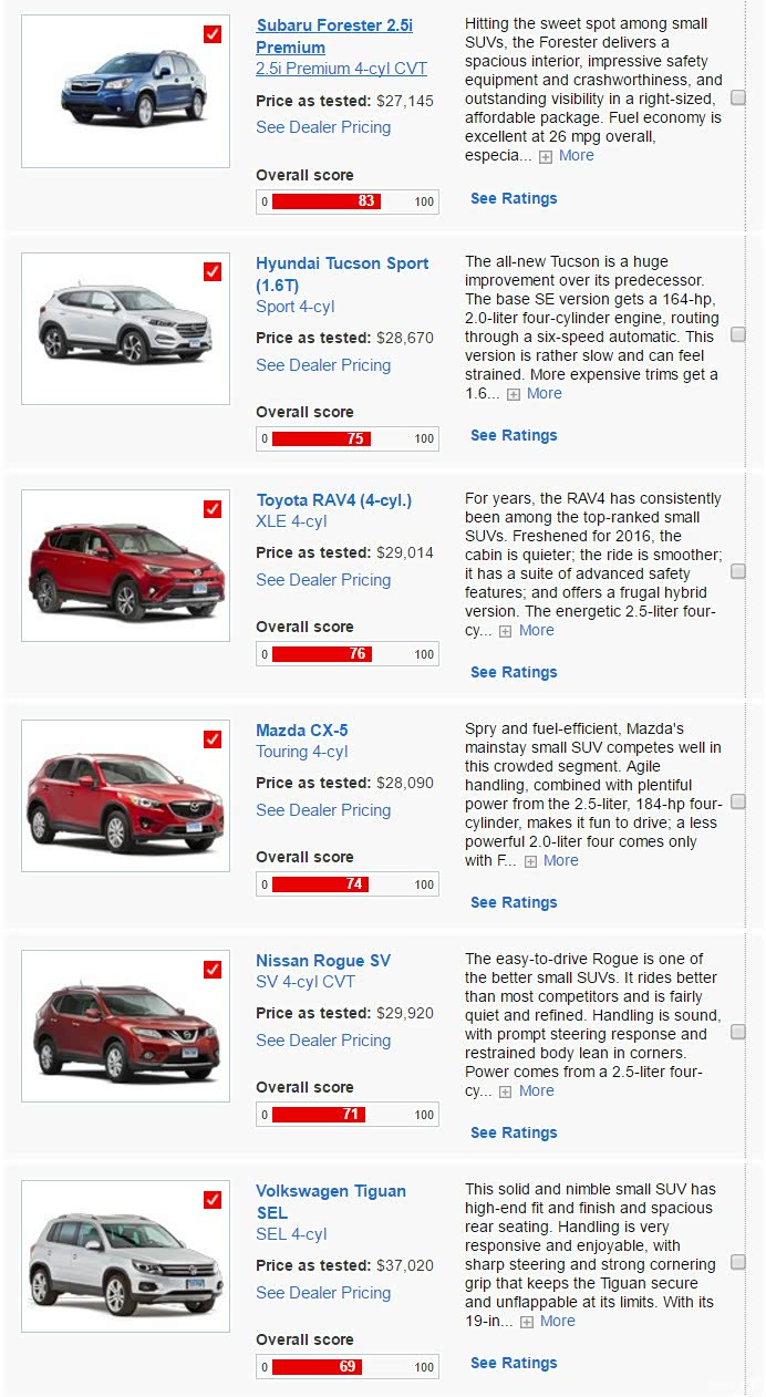 大家选车时候尽量自己试试,我给大家列一下美国Consumer Reports的small SUV排名。这个机构应该是比较公正,但是我个人觉得水分还是不少。大家自己斟酌吧。