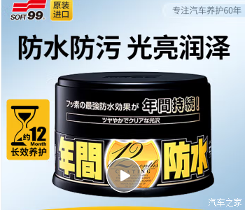 5、SOFT99年间蜡。化学小子耗尽之后看SOFT99京东自营特价,遂入手。这个蜡干燥速度非常快,非常难下蜡,必须抹一个钣金面就立刻擦拭,否则手动基本擦不动;即便刚抹完一个钣金面就擦拭,擦拭的费力程度可能是SOFT99镜艳的两倍!效果很好,我目前只用了一次,打蜡后4个小时开始下雨(车蜡其实还没完全稳固,这个是非常不利的条件),连续下了4场阵雨,总持续时间大致4个小时。雨后全车都是完整的圆球状雨水站立,和我一起停靠的车相比,雨水干燥速度非常慢,别人的车身雨水完全干燥后,我车上过了夜依然有大量圆球状雨点站立;并且干燥后不留雨痕,停靠在一起的其他车身漆面哪怕是刚洗过车的也是布满明显的雨痕。