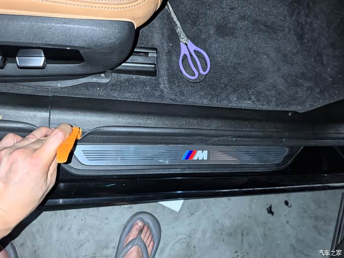 用内饰翘板或一字批头从这里往上撬,撬开门槛盖板