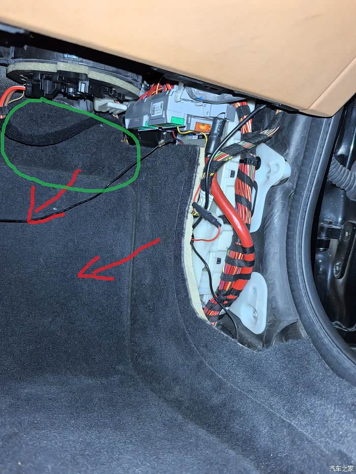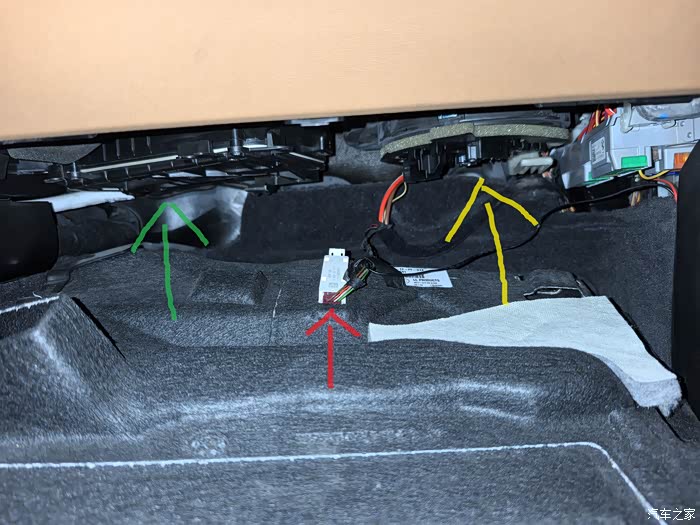 拆开下盖板就可以看到:绿箭头所指是空调格,黄箭头所指是鼓风机,红箭头所指是脚灯插头,拔掉红色插头。