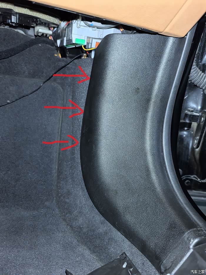 直接用手从箭头处往外扒,扒开门侧饰板。(门侧饰板内表面也就3颗铆钉固定,直接扒开就行)