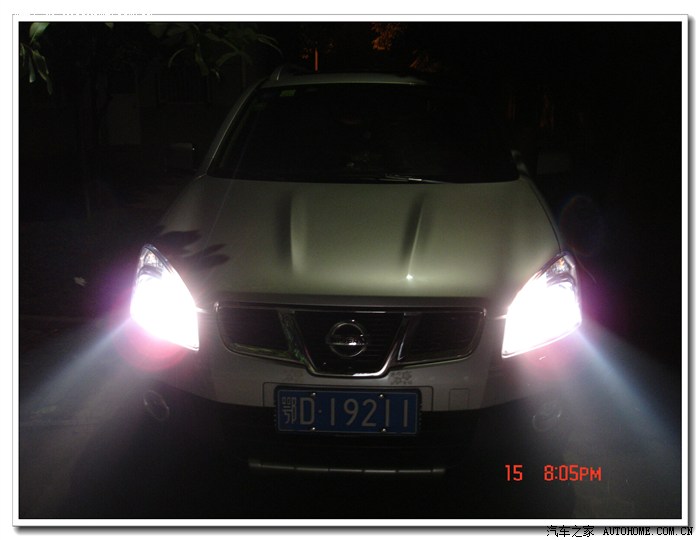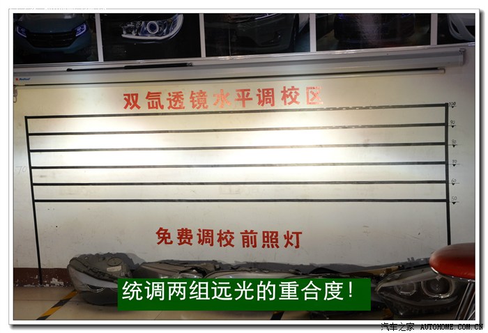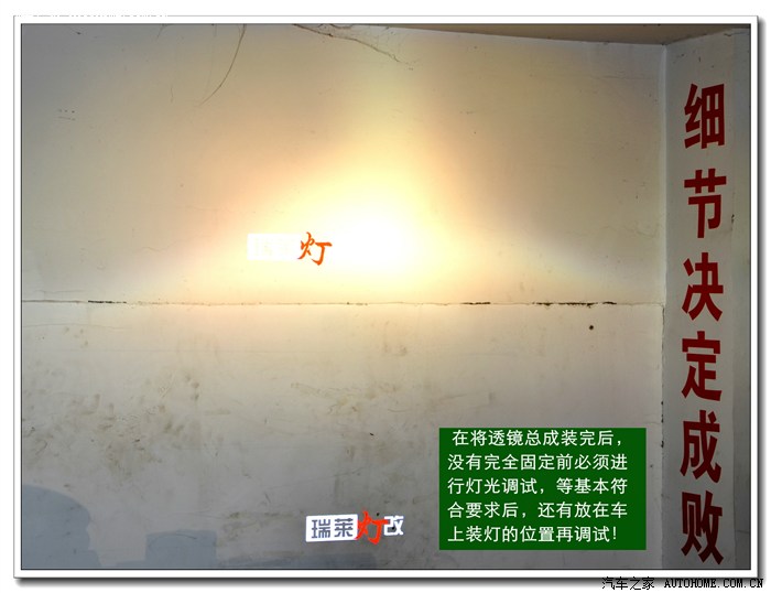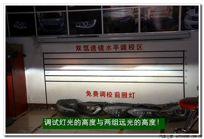 8、 最后将大灯总成(在密封玻璃罩之前)在车上车灯的安装位置上,打开近光与远光,将灯光照射在专用调光板上(也可用红外线水平仪)进行最后调整;包括:近光切线水平、透镜变光电机的测试、电动灯光高低调节功能的调试等。