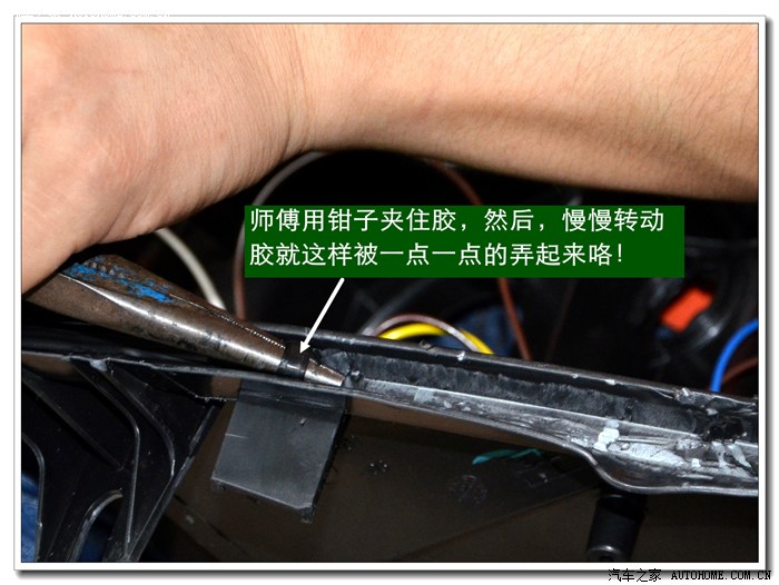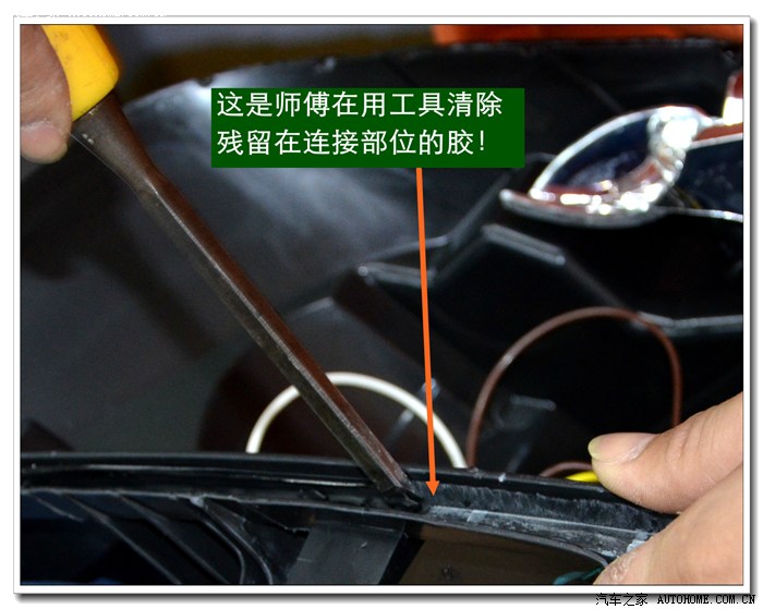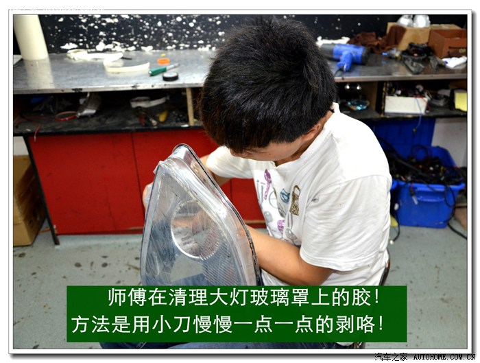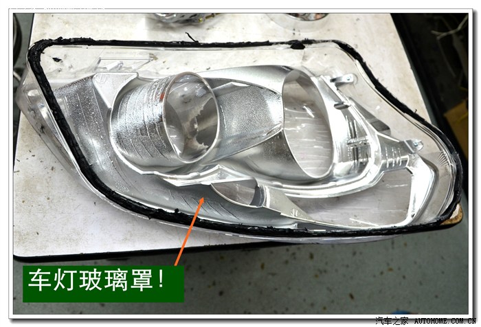 6、 大灯灯罩拆开后就要将灯罩与底座上原来的密封胶清除干净,便于以后上新的密封胶密封。