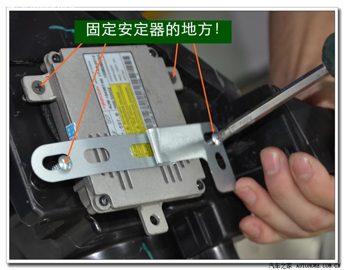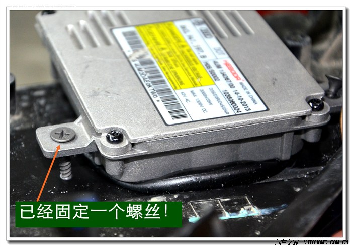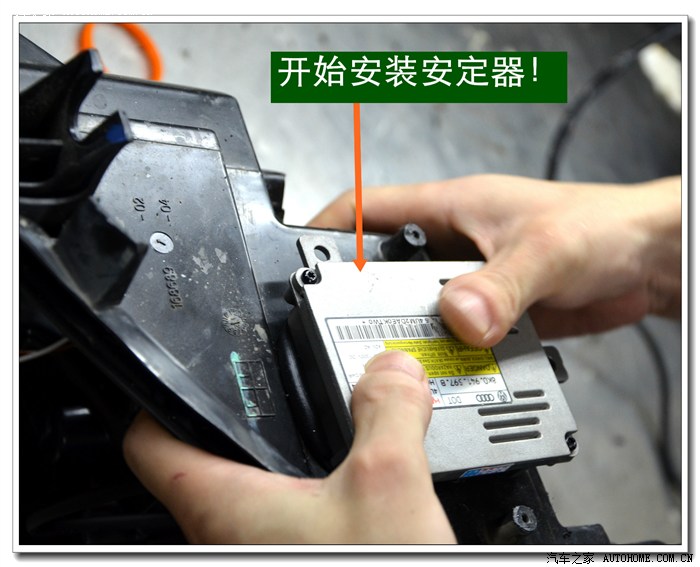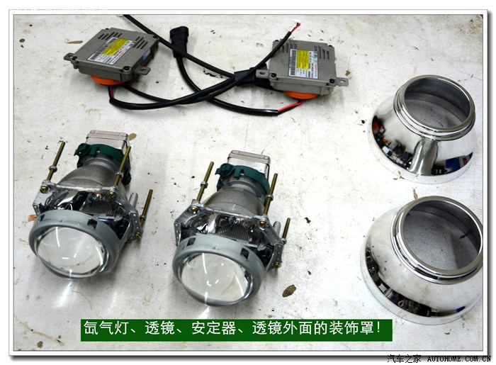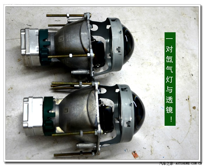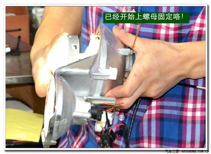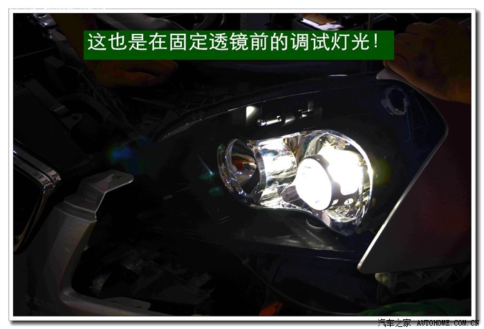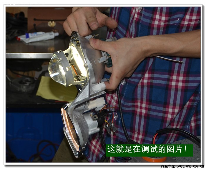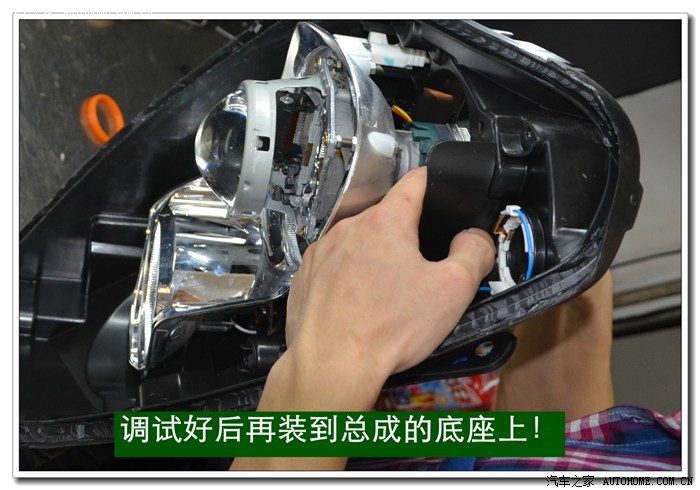 5、 在等待大灯总成加热的同时,将准备好的透镜、灯泡、安定器等配件连接好,然后根据具体情况进行聚焦调试,在调光板上检查近光切线的完整度、远光的聚光形状、左右灯泡的色温、亮度是否一致,调好后再装好固定透镜与灯碗的长螺杆。准备连接在灯碗上。
