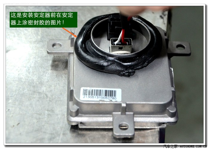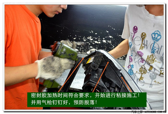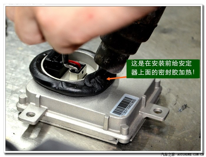 11、在总成与大灯玻璃罩的连接槽里填好密封胶,放入烤箱加热到规定的时间(即使密封胶融化的时间)取出后进行密封。密封时要注意:玻璃罩与底座之间不能留有缝隙,否则安装车上后会有跟改装前不一样的缝隙。
