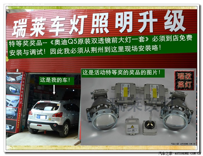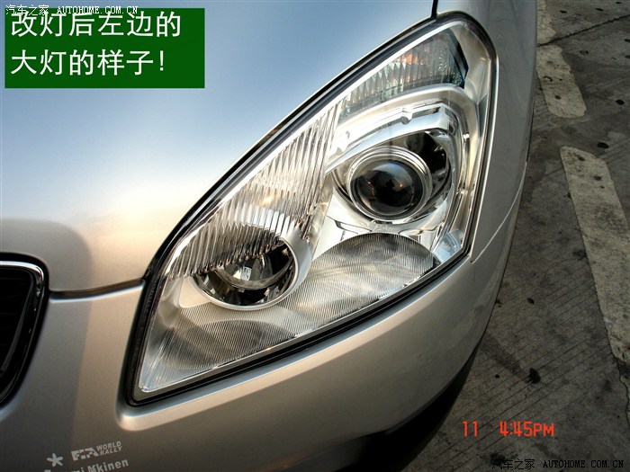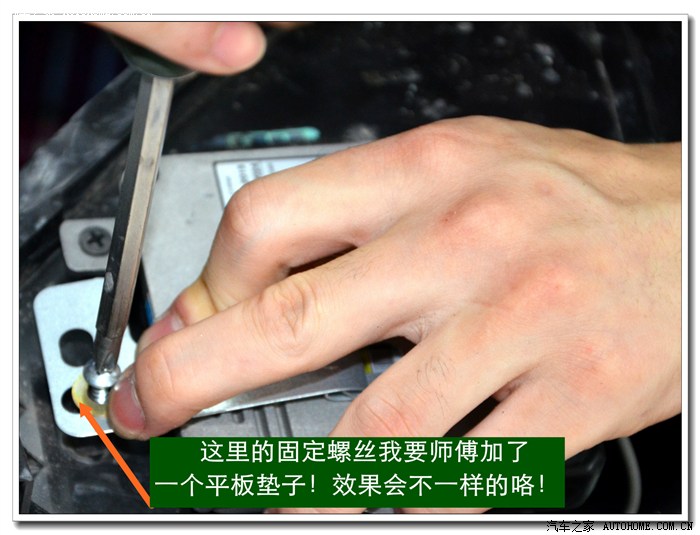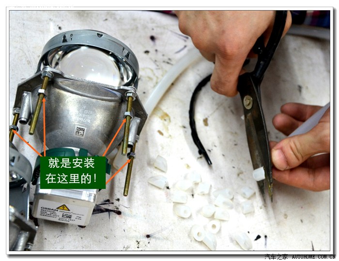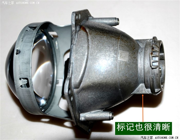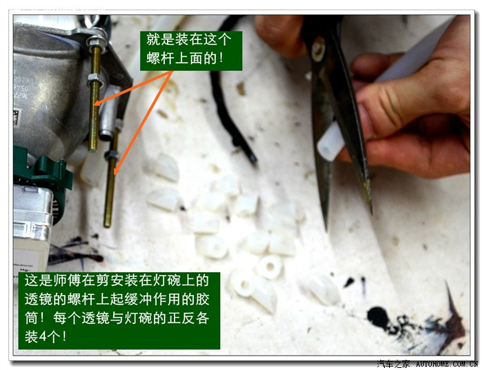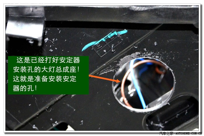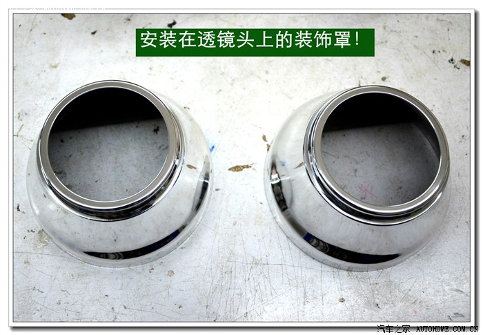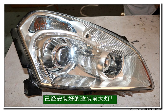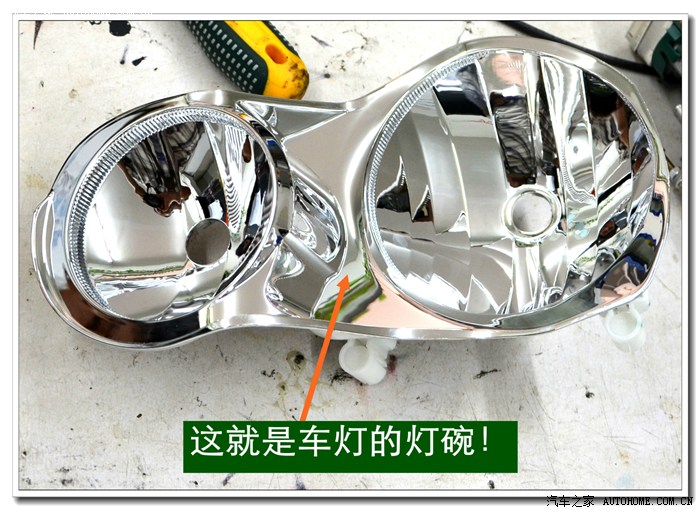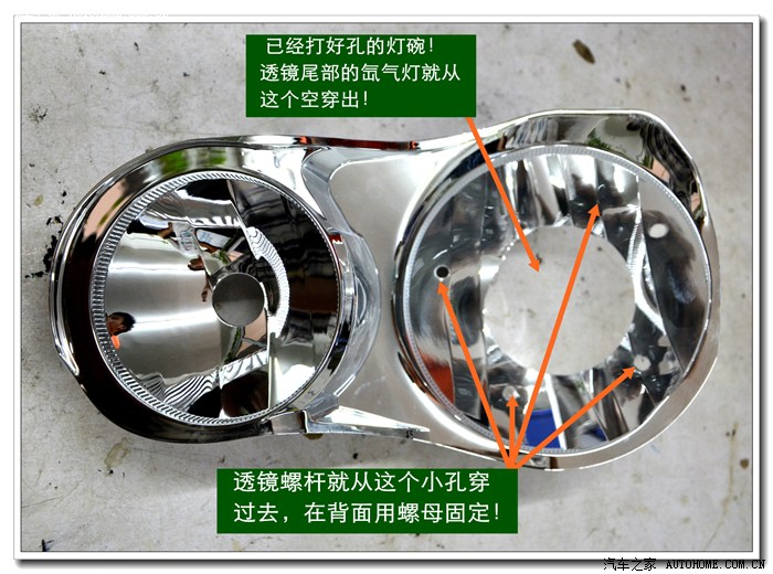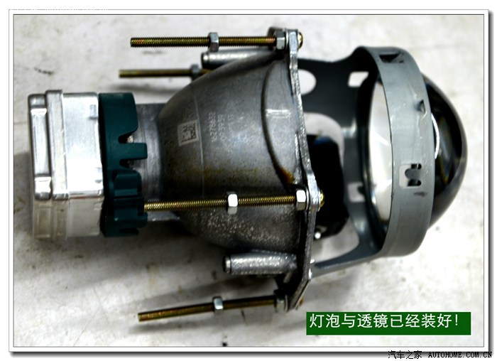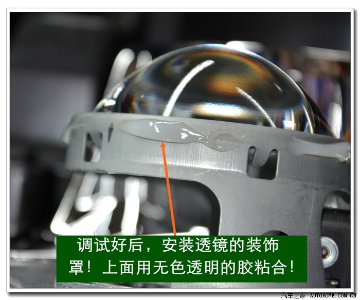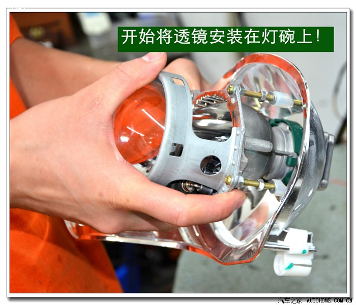 7、 在大灯的发光灯碗上根据用的透镜的大小做好记号打好安装透镜的洞与连接的螺杆孔。然后把透镜安装在上面。安装透镜时的注意事项:一、透镜安装的深度套适中不能太前,否则就会透镜头会顶到大灯的玻璃罩;太后会影响到大灯总成后面的灯盖盖不好,同时还会影响电动调节灯光的高度。二、透镜的切线水平;必须在固定好之前调好。三、透镜的远光与原车的独立远光融合度的调节,以达到最佳远光效果