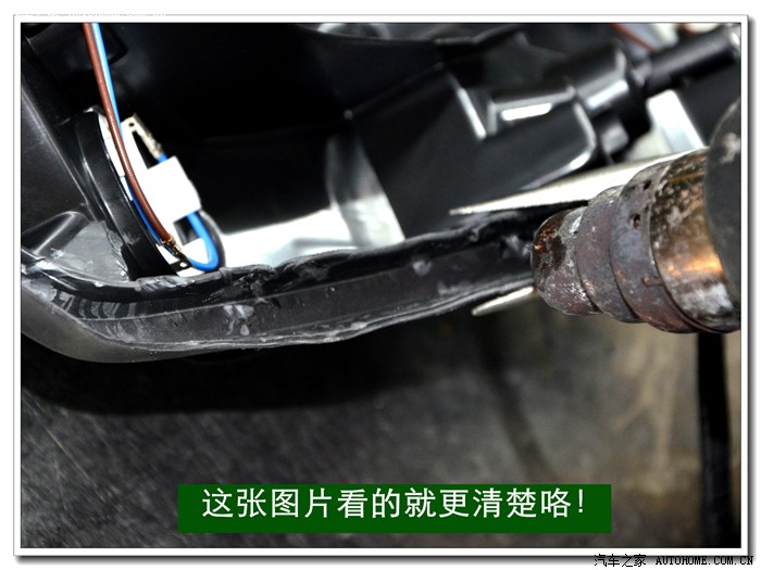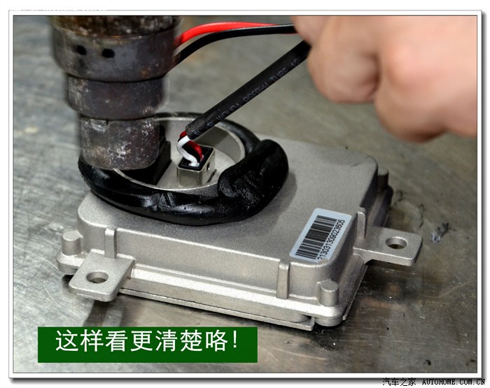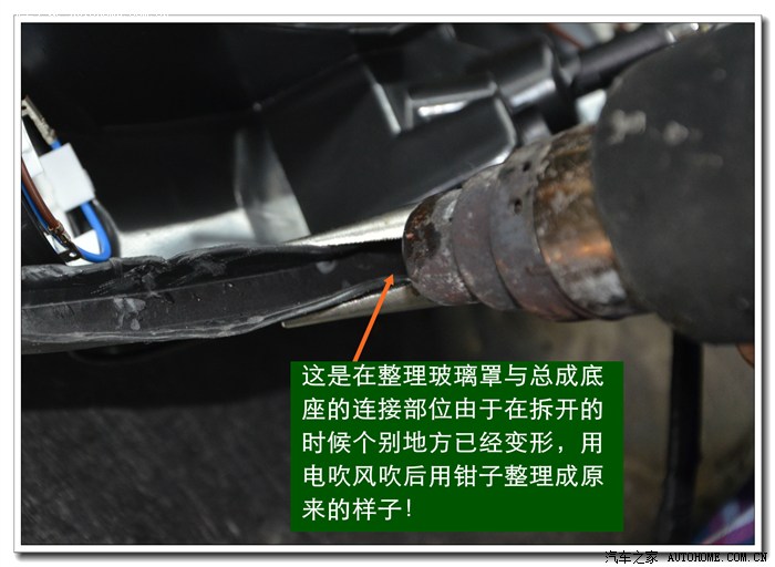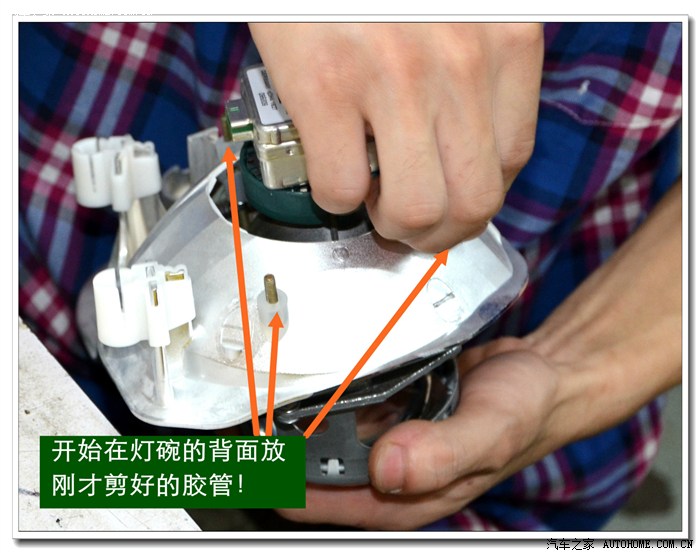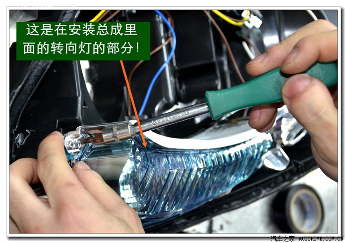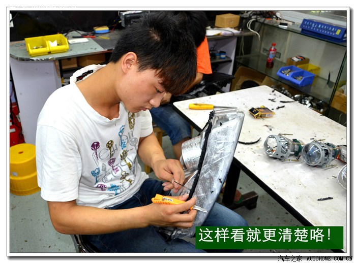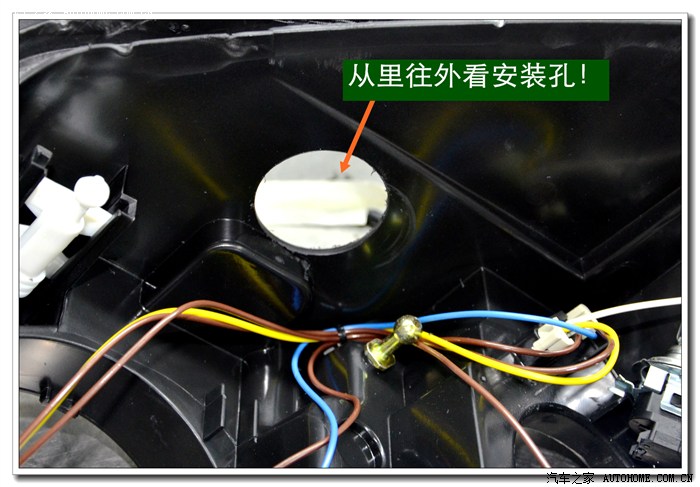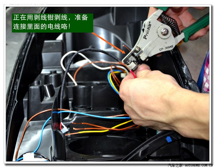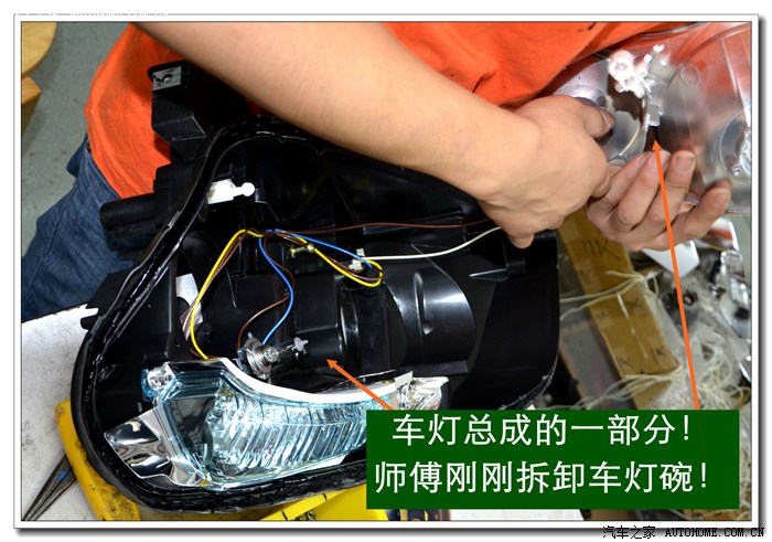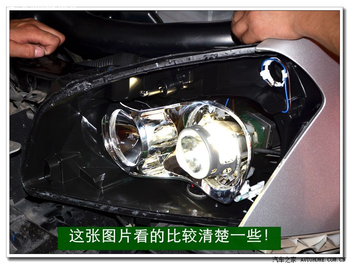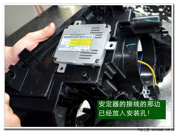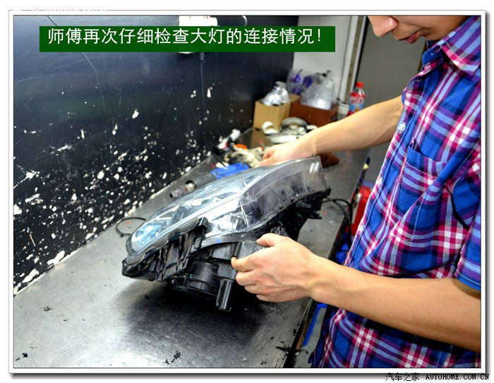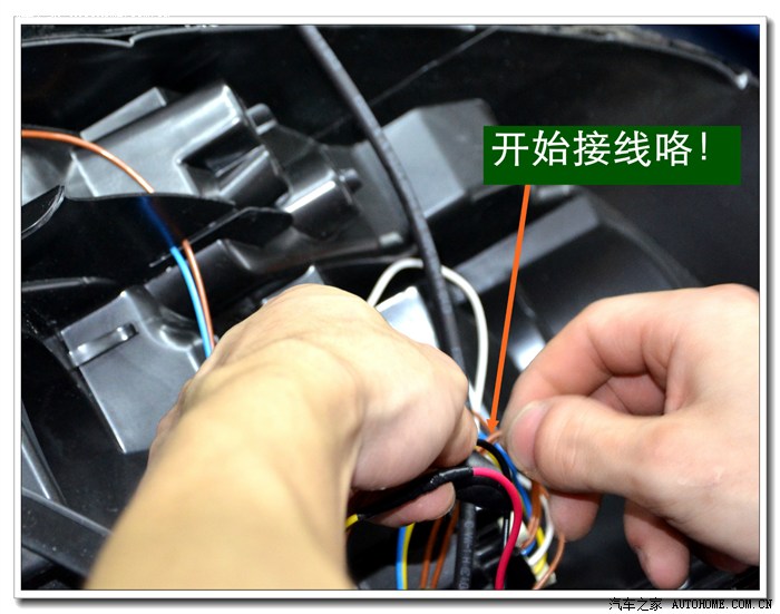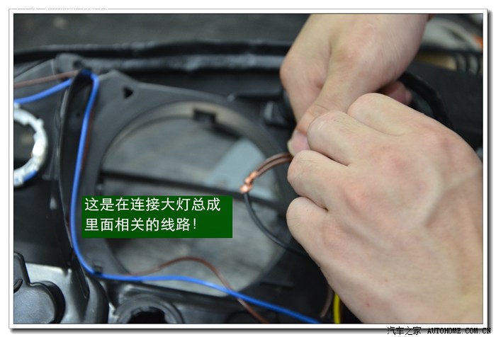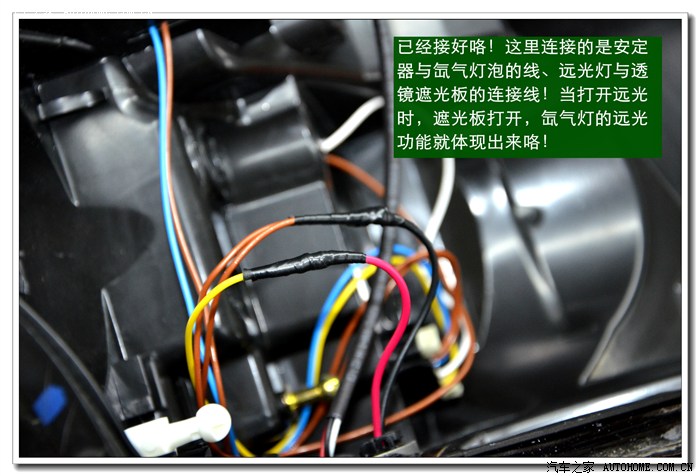 9、 完成上面的工序后,各种接线一定要按标准连接与包扎好,全部放在大灯的灯碗背后的总成里面,从不同角度看都不能有接线露出,以免影响美观。