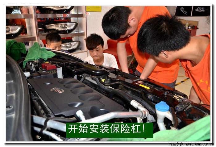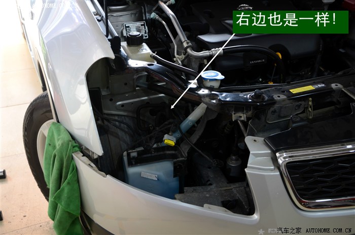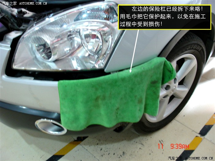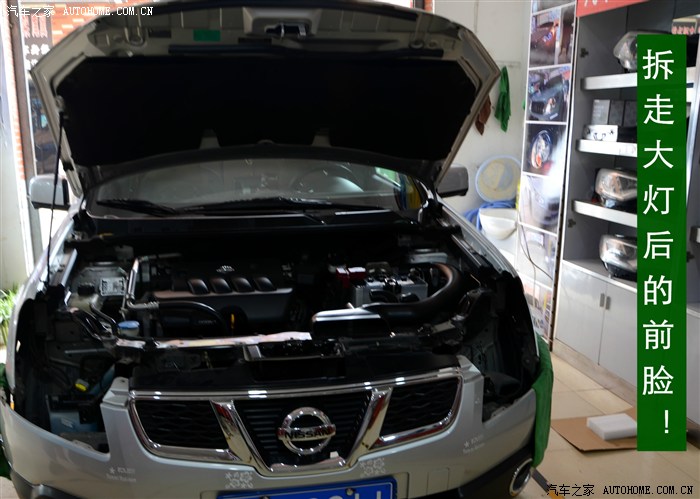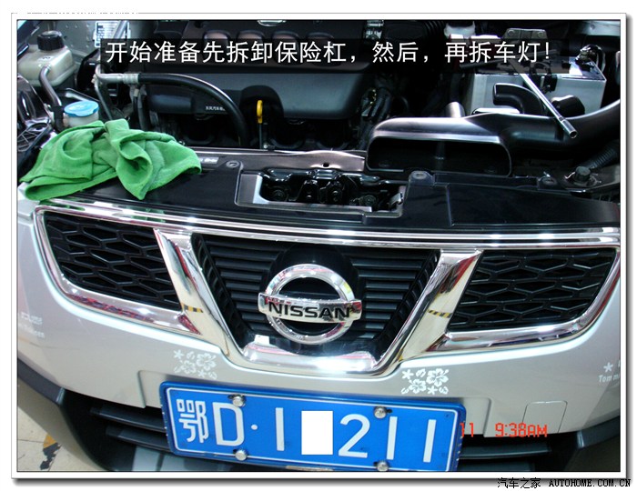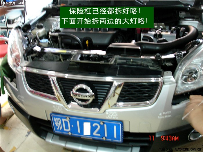 2、 由于逍客的前保险杠是挂在大灯下沿的一排挂钩上的,所以必须先拆保险杠。拆保险杠时要特别注意两侧的黑色轮眉,拆的时候注意用力的力度。