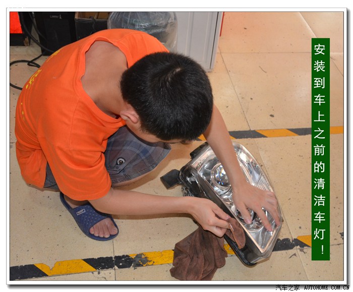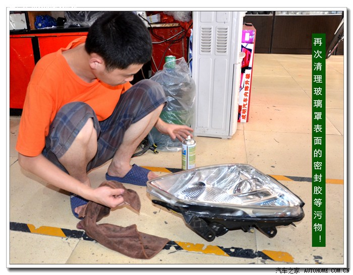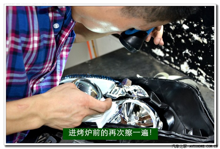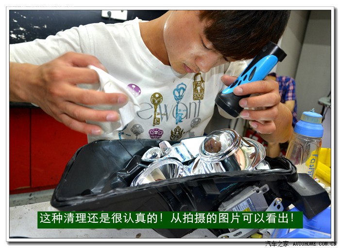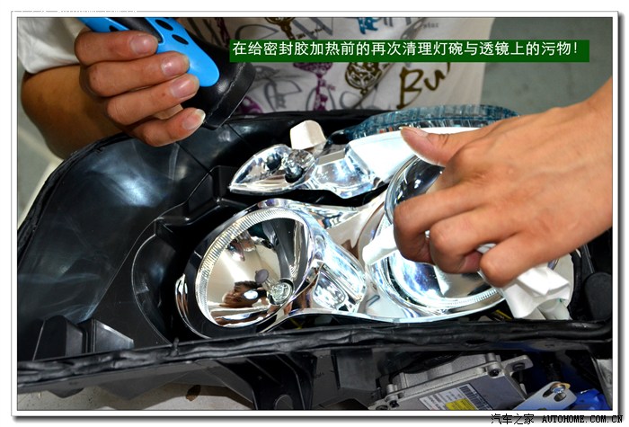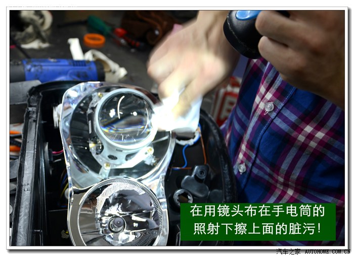 10、用镜头布粘上无水乙醇清洁大灯的玻璃罩、灯碗、透镜里面的污物,清洁时应该用手电筒灯光照射的擦拭;如果需要安装天使眼的可以在此工序之前安装。